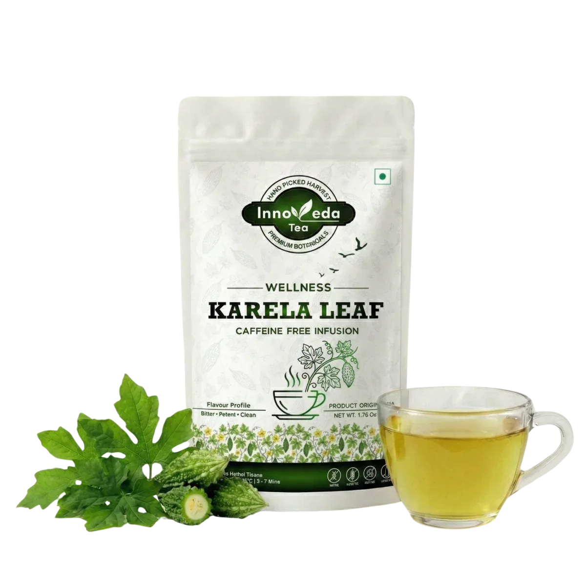 Cleanse and regulate. Similar to the fruit but with a more herbal profile, Karela leaves aid in detoxification and metabolic support.