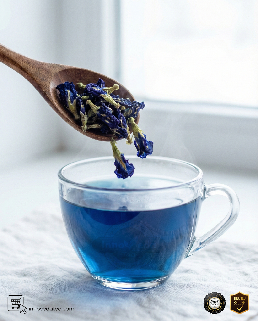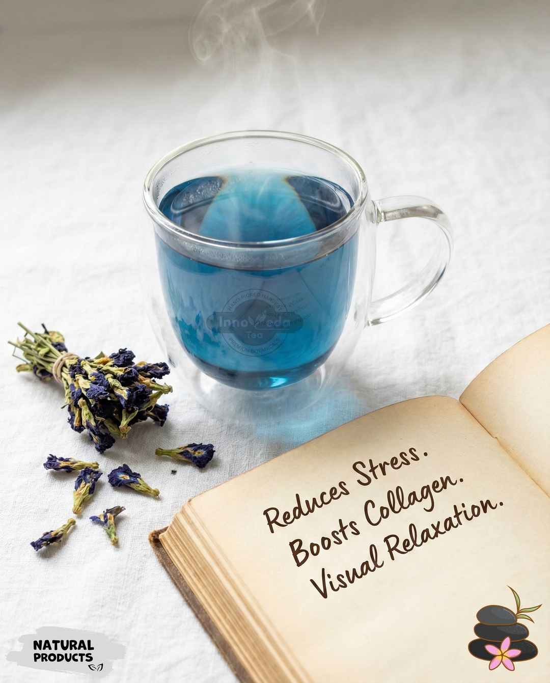 Witness the magic of Innoveda. The tea brews a stunning sapphire blue that turns violet with a squeeze of lemon. Mild and woody in flavor, it is as much a visual feast as it is a wellness ritual.
