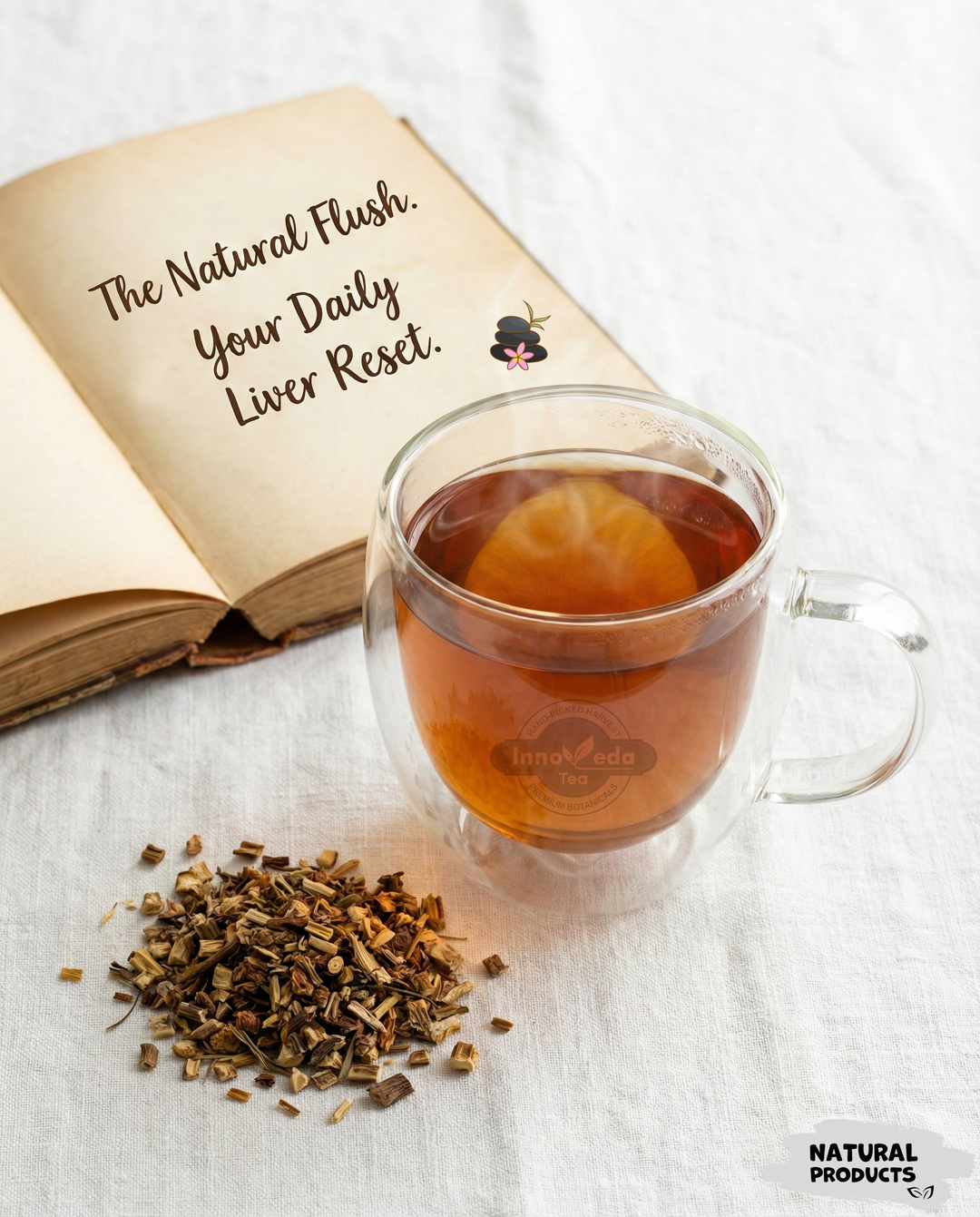 We wanted to create a "Natural Flush" that you actually enjoy drinking. Deeply roasted and robust, this root tea mimics coffee's depth without the jitters. It's the world's most trusted botanical for liver support, providing a grounding moment in your day that actively works to cleanse your system.