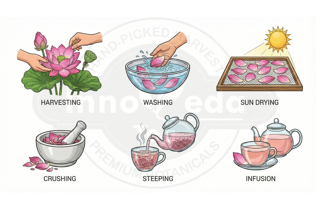 Harvested from pristine ponds where the Sacred Lotus blooms. The petals are collected by hand to avoid damaging their delicate structure.
