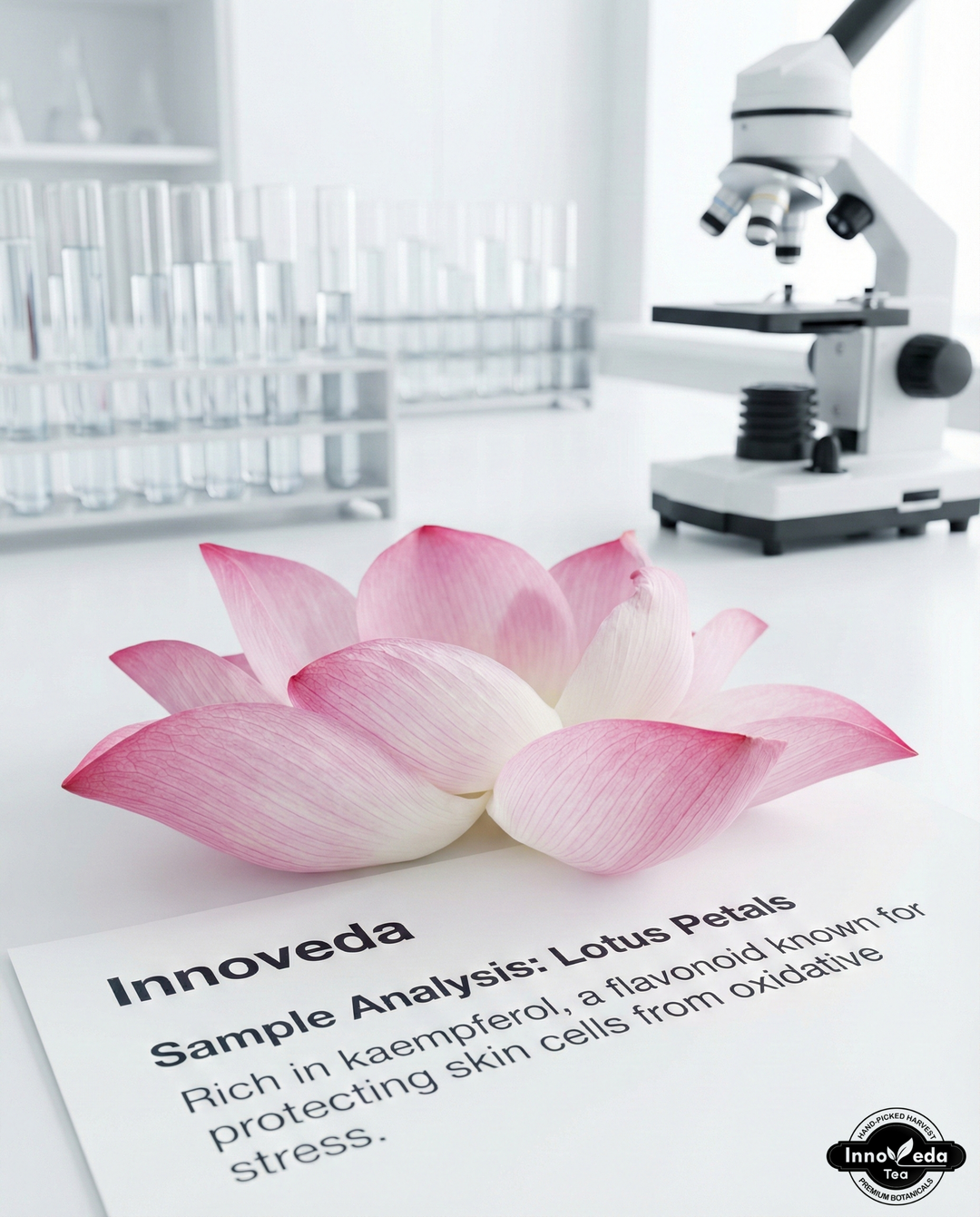 It is a revered flower in Eastern traditions. Scientifically, it is rich in kaempferol, a flavonoid known for protecting skin cells from oxidative stress and inflammation. In Ayurveda, it is considered a Sattvic herb, used to cool excess Pitta heat and open the heart chakra for spiritual well-being.