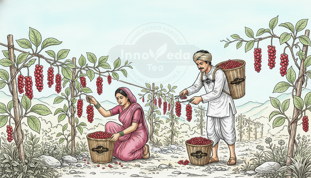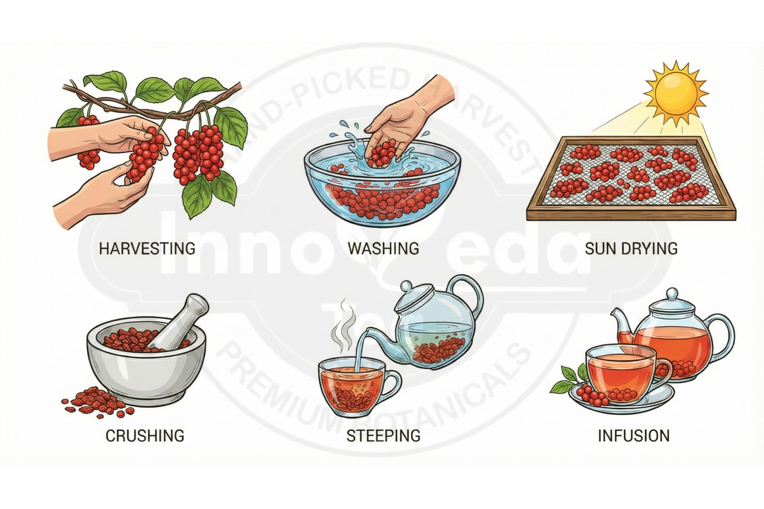 The berries are sun-dried to preserve their complex flavor profile and adaptogenic properties.