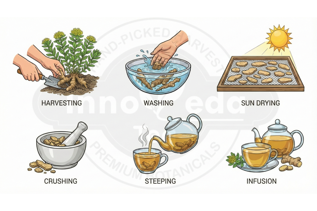 The roots are washed, sliced, and dried. We ensure the rosavin content is preserved for maximum efficacy.