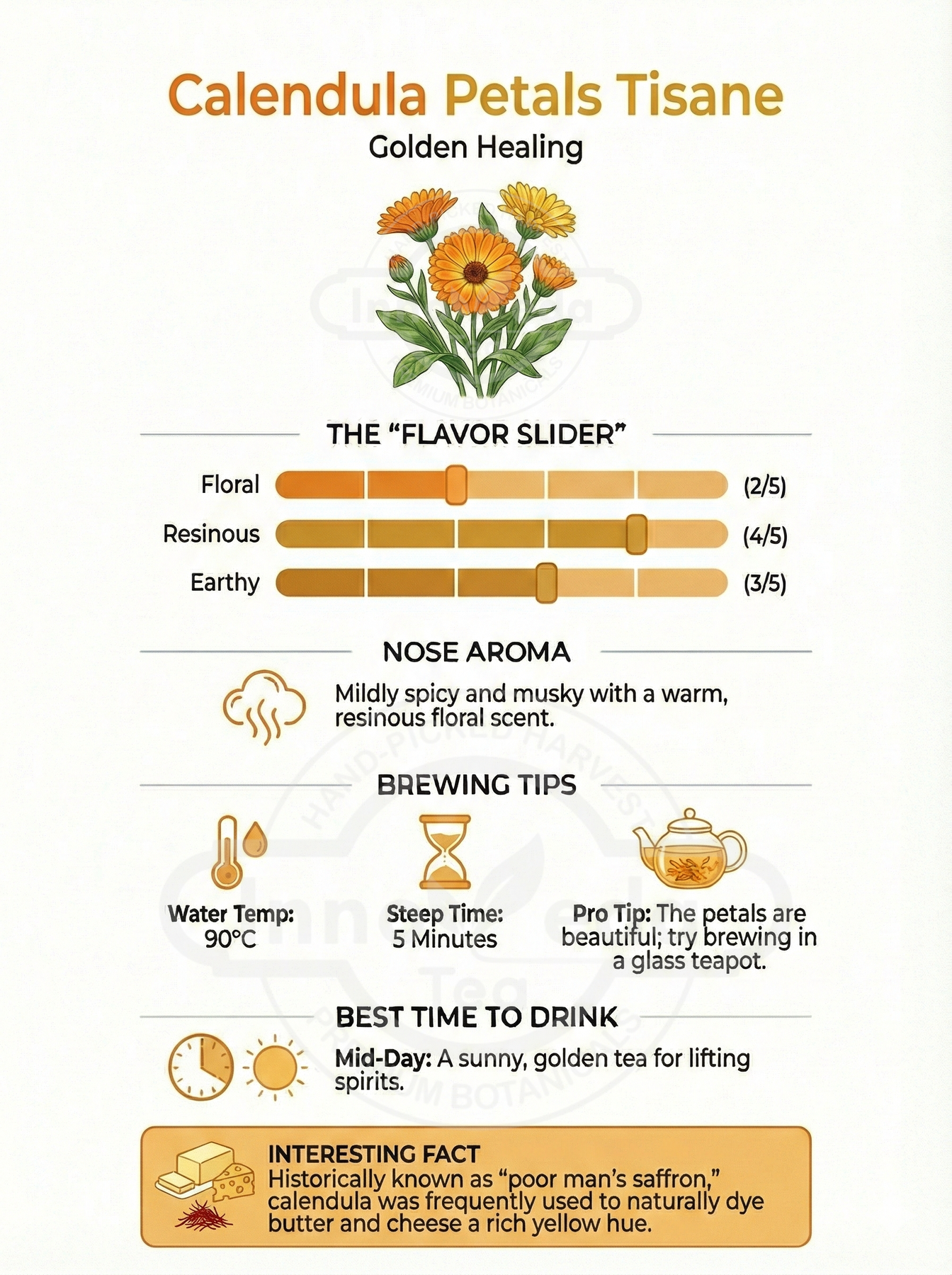 Calendula-Tee bietet ein komplexes Geschmacksprofil mit einem blumigen und erdigen Geschmack. Seine therapeutischen Vorteile machen es zu einem großartigen Mittel gegen Halsschmerzen, Magengeschwüre, Blasen und Zahnfleischentzündungen.