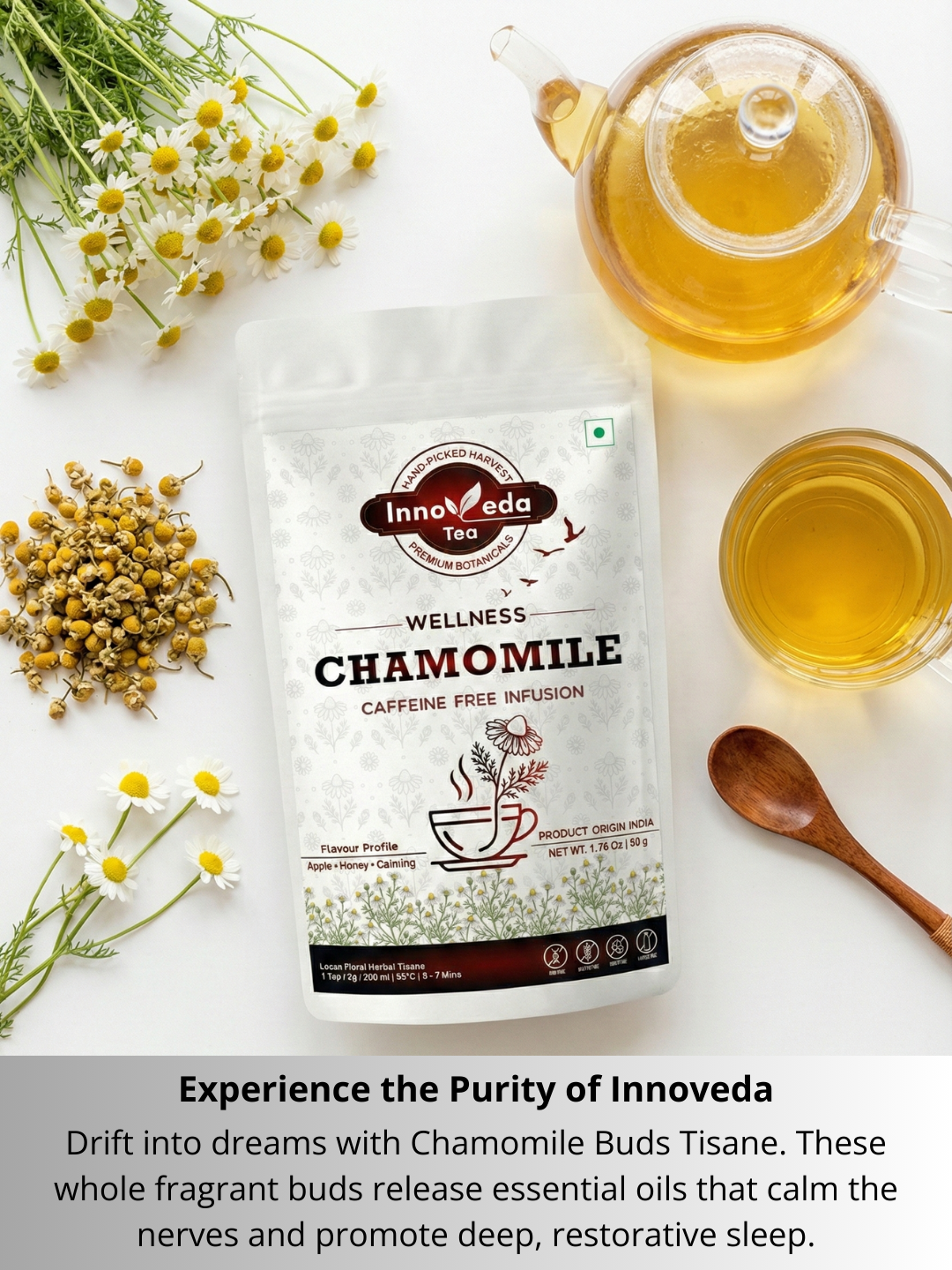 Une tasse de Camomille Pure Tea, c'est comme prendre des mini-vacances sans jamais quitter la maison ! Détendez-vous et profitez de la couleur dorée et de la saveur fruitée tout en profitant des nombreux avantages : du blanchiment naturel de la peau et de la réduction des poches sous les yeux à l'amélioration de la couleur des cheveux et à la relaxation du corps. C'est un moyen entièrement naturel de renforcer votre immunité et d'accélérer la guérison.