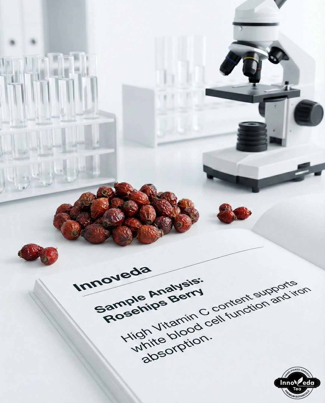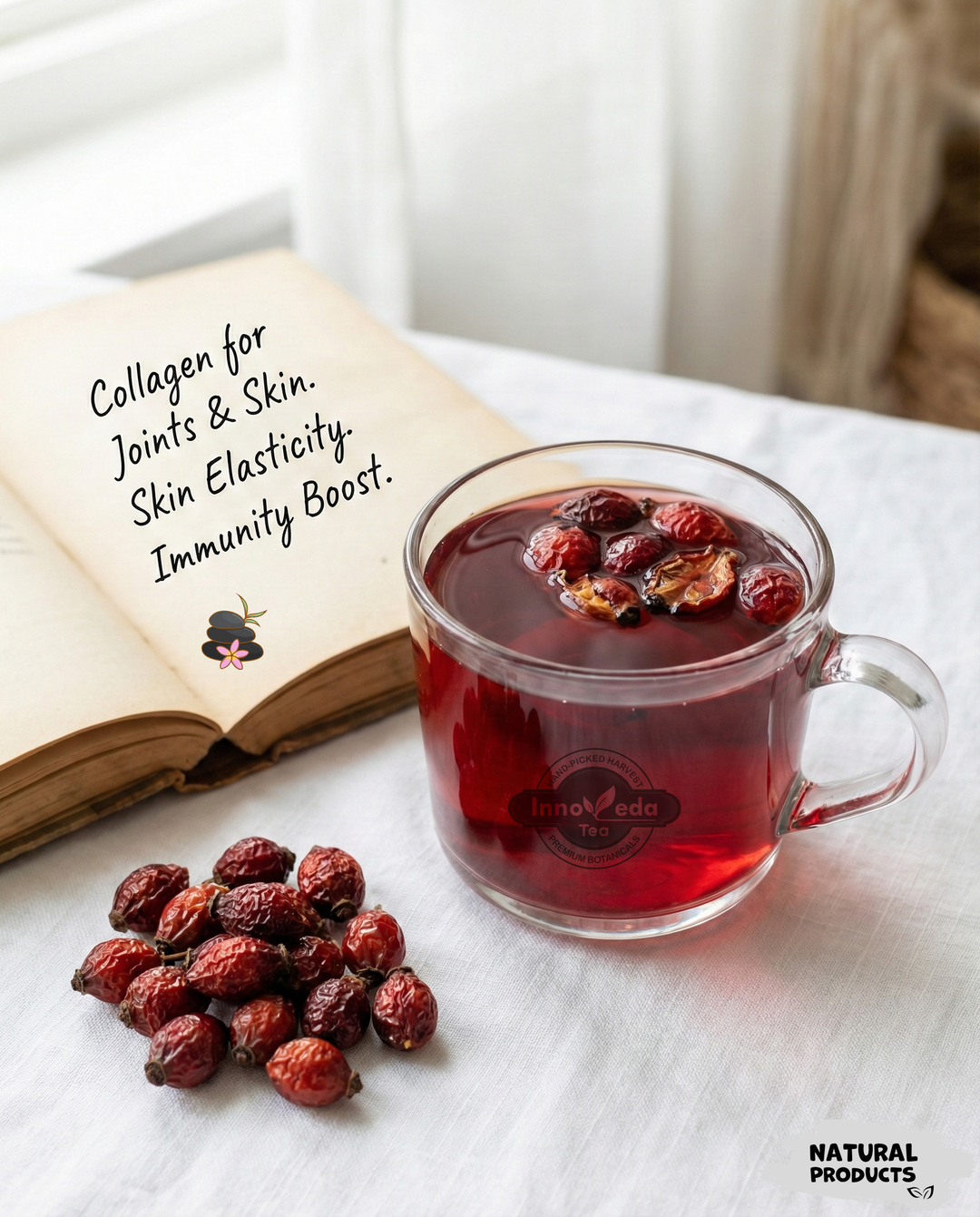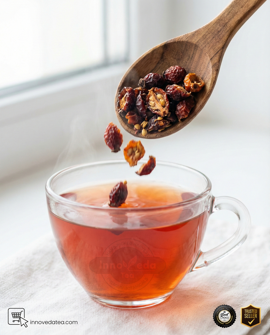 Innoveda’s Rosehips Tisane is tart and tangy, similar to hibiscus but with a distinct berry flavor. It is a zest for life in a cup.