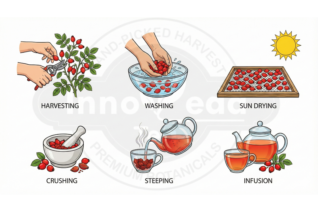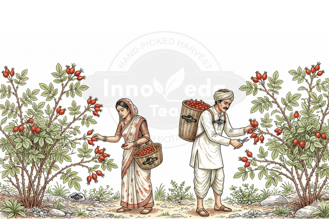 Harvested from wild rose bushes in the autumn after the first frost, which sweetens the berries.