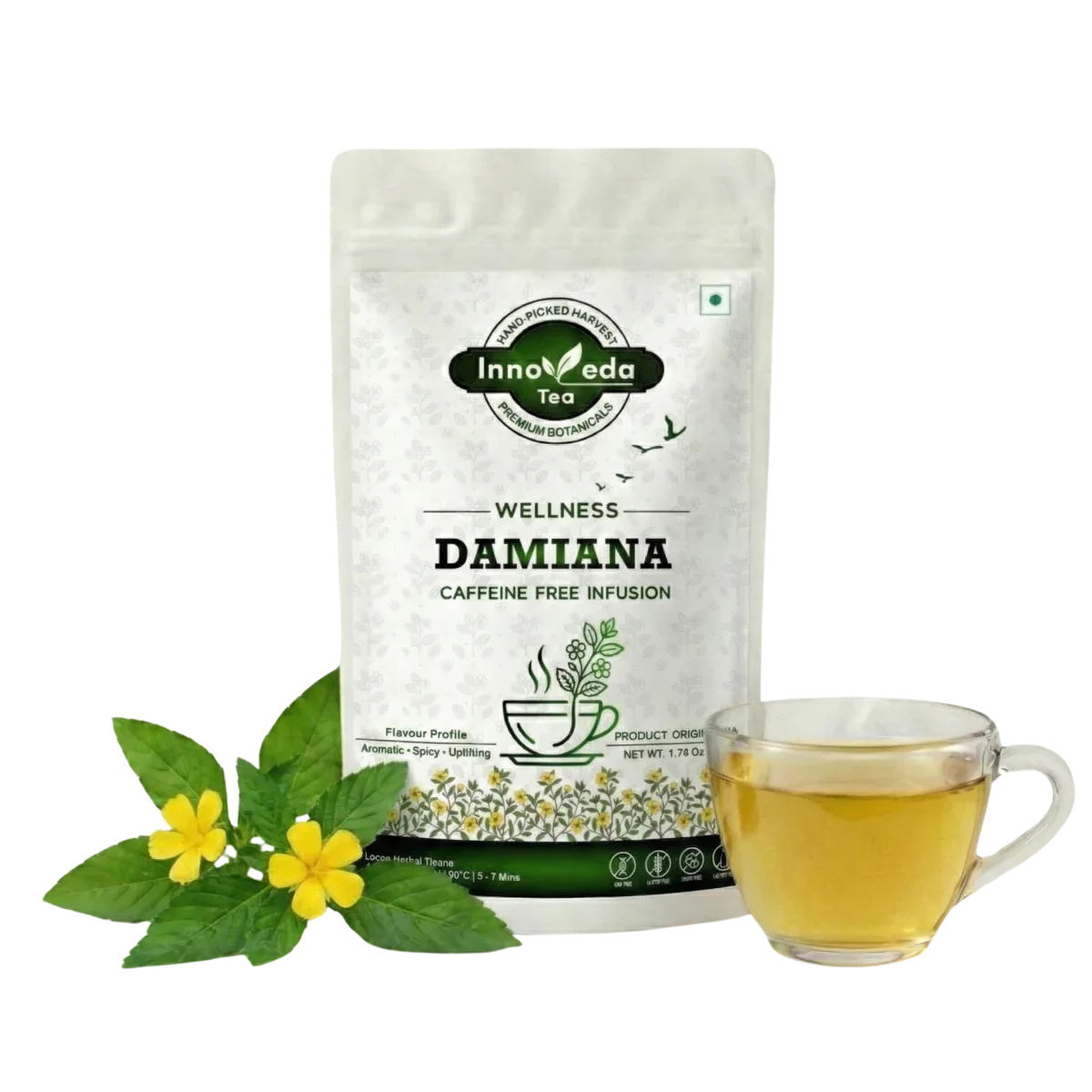 With a flavor often compared to chamomile but with a fig-like fruitiness and spice, Innoveda’s Damiana is a smooth, pleasant tea that lifts the spirits.
